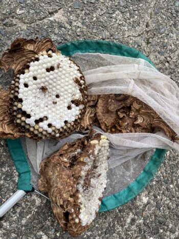 今日は川本町で2件、桜江町で1件キイロスズメバチの駆除に行きました。2件目は巣がかなり大きくなっていて、蜂も大量…屋根の勾配が急だったため、足元が安定せず、一番大変でした💦また巣を作り直す可能性もあるので、後日もう一度様子を見に行くことにしました。台風前で風が強く、スプレーの噴射も行き届かず…主人は蜂に取り囲まれていました💧刺されなくてよかったです。
